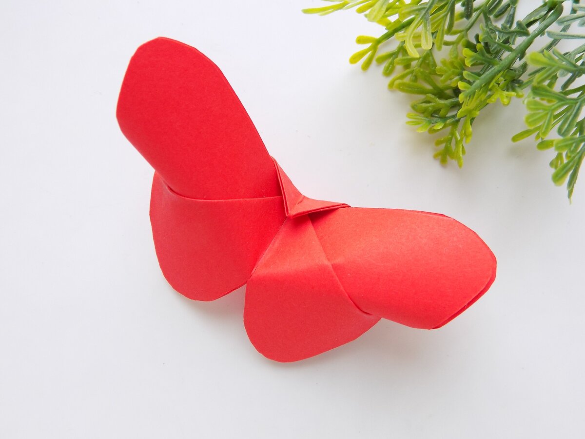 Осталось аккуратно согнуть бабочку по средней линии, это позволит зафиксировать ее крылышки. Такая бабочка из бумаги у нас получилась.