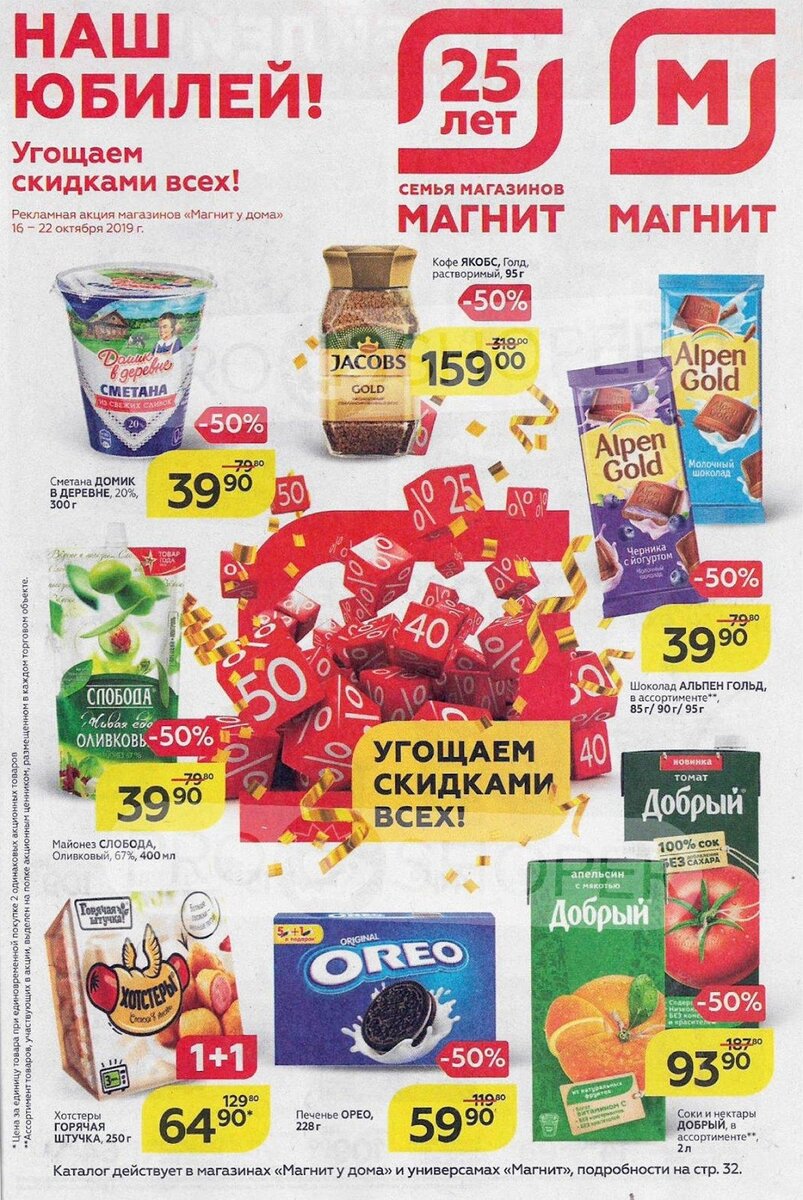 Все вы любим выгодные покупки по сниженным ценам. Как известно, все крупные магазины балуют своих покупателей хорошими скидками и акциями. По статистике, самыми востребованными магазинами являются Магнит и Пятерочка. Сегодня мы отправляемся за выгодными покупками в Магнит! Внимание, сроки данной акции продлятся до 22.10.2019. скидки помогут сэкономить до 50% от стоимости товаров. А теперь, берем корзину и отправляемся экономить! Что есть в каждом холодильнике? Конечно, сметана или майонез! Это базовый продукт для заправки салатов или других блюд. На этой неделе покупаем их со скидкой. Любите соки? Смело забегайте и за ними. Конечно, каждый из нас любит «что-то к чаю», на этой неделе можно неплохо пополнить запасы разных сладостей. Можно приобрести шоколад и печенье. На этом вкусные продукты не заканчиваются! По скидке можно приобрести еще ряд различных печенек, сырки и йогурты, творог и, даже. Гречневую крупу! Переходим к более пикантным продуктам! По скидке Магнит предлагает нам куп
