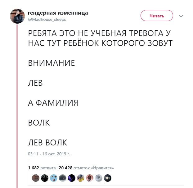 В Твиттере стал вирусным пост пользовательницы с ником "гендерная изменница". Она сообщила, что встретила ребёнка по имени Лев с фамилией Волк. Подписчики пришли в неописуемый восторг, публикация собрала больше 20 тысяч лайков и десятки примеров не менее смешных и странных сочетаний имён и фамилий. В комментариях пользователи рассказывают, как знали людей по имени Лев Белоконь, Света Орган, Роман Орган и даже Роман Карман. Вы не поверите, но на свете живут люди с именем-фамилией Катя Дима. А как вам три сестры - Дорофеева Фея, Дорофеева Филофея и Дорофеева Дорофея? :) Лев Филин, Ле вБабник, Убейволк, Непейпиво, Затуливетер - каждый из нас хоть раз в жизни встречал обладателей по-настоящему говорящих фамилий. Тут и смешные картинки подъехали. А как бы вы назвали своего ребёнка, будь у него фамилия Король, Добрыйдень или Спасибо? Да, родителям бывает непросто выбрать для детей благозвучное имя, чтобы оно гармонично сочеталось с фамилией и отчеством. Но иногда, кажется, взрослые просто