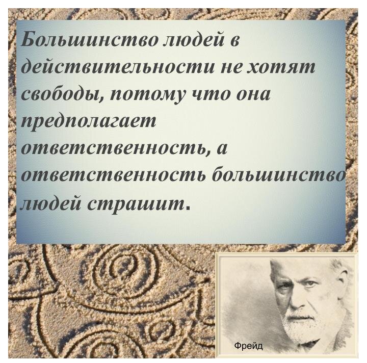 Ощущаю истинность этого высказывания. Оно всегда мне помогало понять причины поступков окружающих людей. В чем я согласен с дядюшкой Зигмудом? В том, что люди бегут от свободы. В сторону вседозволенности они бегут. Потому, что разница между свободой и вседозволенностью в том, что свобода нужна для чего-то и от чего-то. А это - ответственность. Я сам ее терпеть не могу. Потому, что не хочу быть никому должным. Именно это я понял тогда, когда прочитал эту цитату лет 25 назад. И стало все просто. Люди, по сути, примитивнейшие создания. Они хотят все иметь, ничего не делать, ни за что не отвечать. Думать они тоже не хотят И вот тут можно начать манипулировать. Скажите человеку, что если он что-то сделает и ему за это ничего не будет, а еще подкрепите свое убеждение фактом, то люди пойдут туда, куда вы их отправите. Кстати. Манипулировать людьми просто. Надо понимать цитату Фрейда. Люди бегут от страхов, а это значит они управляемые.