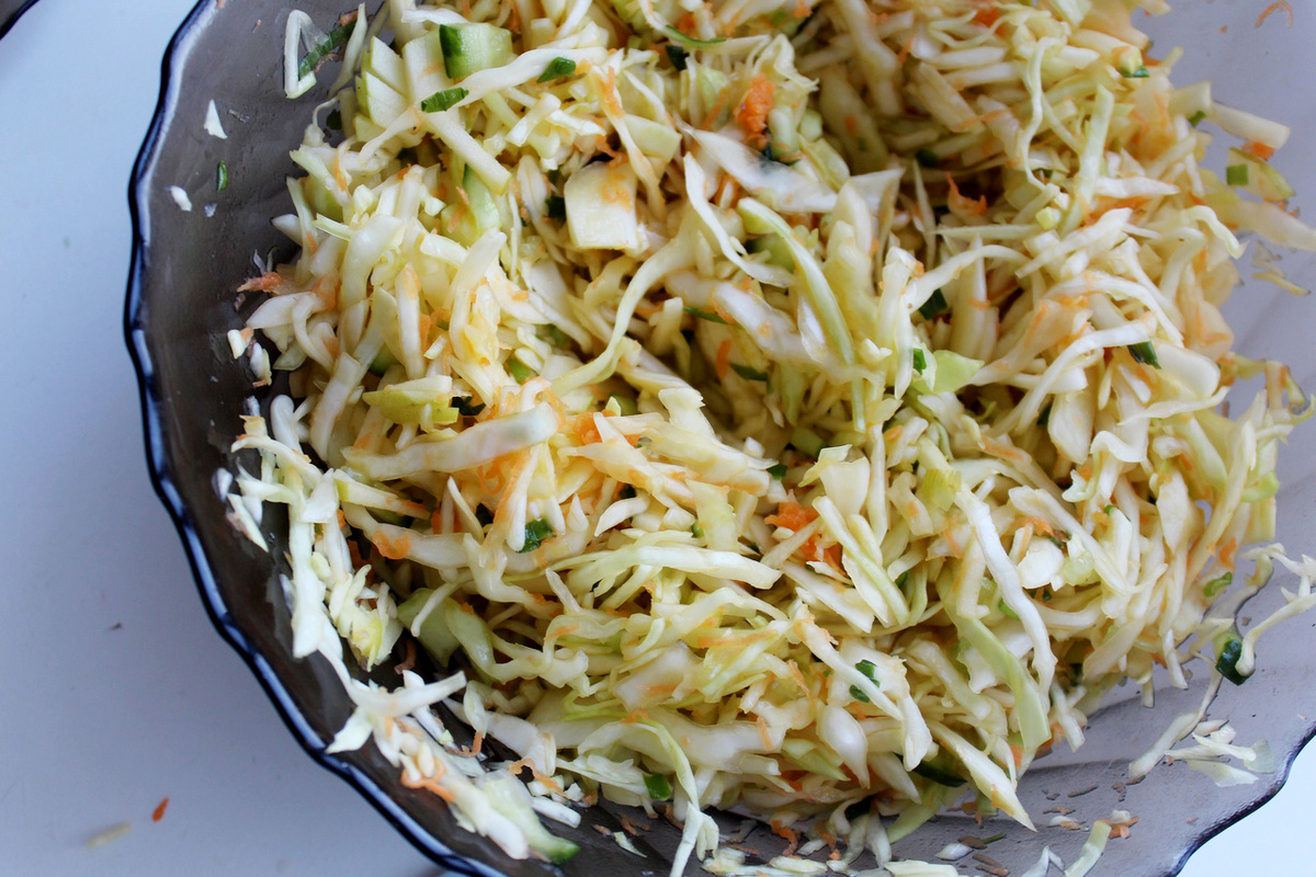 Капусту мелко рубим, хорошенько разминаем. Морковку натереть на тёрке. Мне нравится на мелкой, можно и на крупной, на вкус салата не повлияет. Огурец и половину яблока порезать кубиками. Все смешать. Добавить соль, сахар, уксус и растительное масло. Если на ваш вкус соли много, то добавить вторую половину яблока. Хорошенько перемешать салат ещё раз. Убрать на час, полтора в холодильник. Перемешать еще раз. Кушать и витаминизироваться.