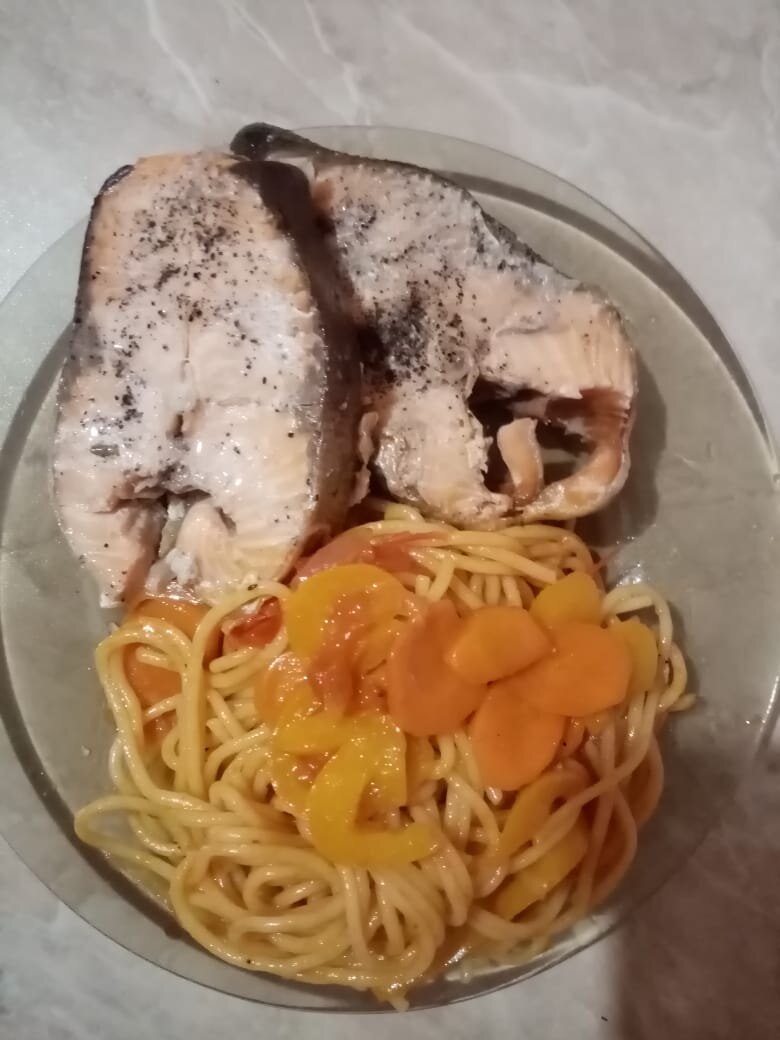 Стейк из красной рыбы и спагетти в овощном соусе!!!