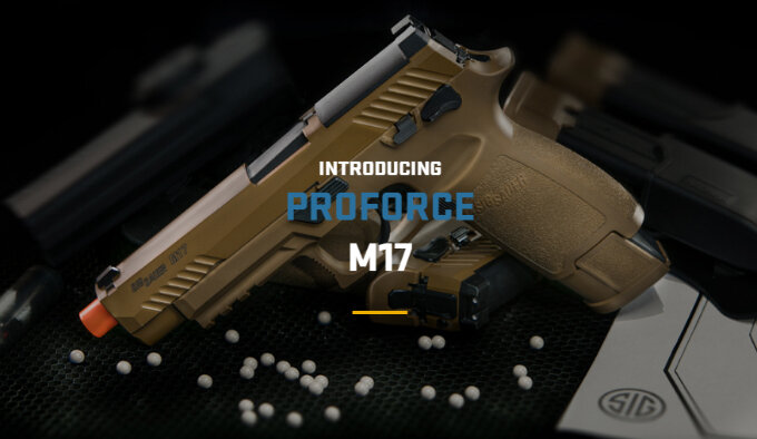 Sig Sauer Inc. объявили о старте отгрузок самозарядного пневматического пистолета ProForce M17, стреляющего 6 мм пластиковыми шариками (airsoft/страйкбол), в двух версиях, работающих на: баллончиках со сжатым углекислым газом (CO2) или на газовой смеси Green Gas.