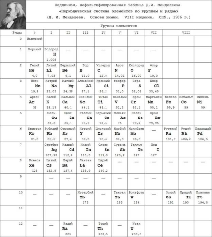 "В оригинальной периодической таблице Менделеева был эфир. Ячейка для эфира находилась в нулевой группе и в нулевом ряду. После смерти Менделеева таблица была изменена, и нулевой ряд и нулевая группа исчезли вместе с эфиром. Элемент, который связывает тело, душу, духовный и физический миры, но не подчиняется нашим ощущениям.