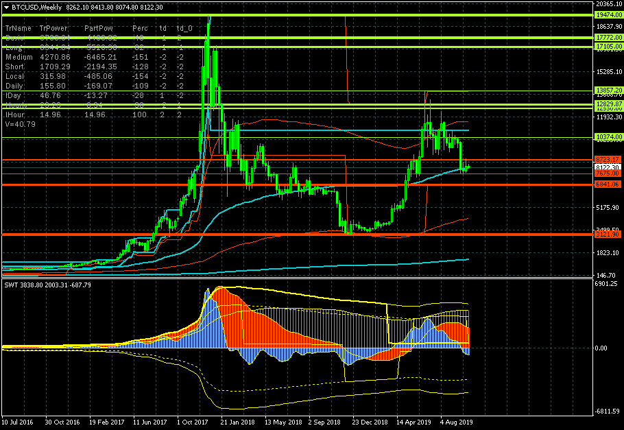 Биткоин: праздник закончился Праздник роста закончился. Впереди суровые будни обычных валютных рынков, на которых нет стабильных трендов. И дело не в биткоине, как таковом. Просто криптовалют стало много, а будет еще больше, и фиатные деньги размываются между альтернативными предложениями, снижая капитализацию чемпионов роста. Это не значит, что мы уже не увидим биткоин вблизи исторических максимумов – на рынке возможно все. Но роста курса на тысячи процентов для биткоина мы уже вряд ли дождемся. Для новых криптовалют вполне возможно. Но "старички" в лучшем случае сохранят достигнутые рубежи. В худшем... Жизнь покажет. Стратегия "купил и держи" приказывает долго жить. Пока что по технике биткоин падает по всем наблюдаемым трендам. И прорыв среднесрочной поддержки на уровне 8723.17 открывает для тестирования долгосрочный уровень 6841.06. Технический анализ трендов Основной тренд - гистограмма бирюзового цвета графика недельного масштаба - перешел к нисходящей коррекции. Долгосрочный