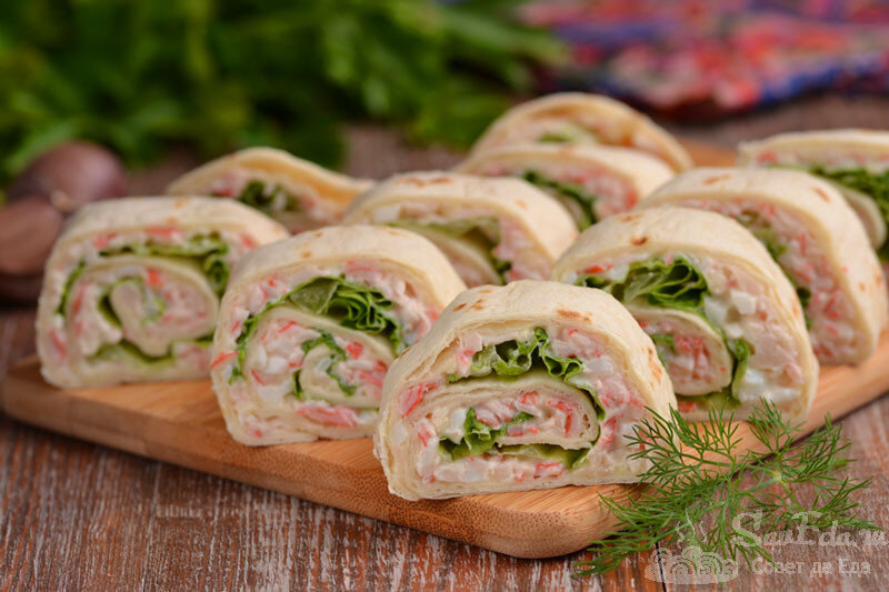 Вкуснейшая закуска за 25 минут на праздничный стол из простых продуктов. Рулетики с крабовыми палочками, куриным яйцом, чесноком, майонезом и зелеными листьями салата. Листья придают закуске сочность, добавляют хруст, а в разрезе делают рулетики очень красивыми. Палочки и яйцо делают закуску очень сытной, а чеснок ароматной. Все продукты хорошо сочетаются между собой и в итоге получаются вкусные и оригинальные рулетики, которые украсят праздничный стол. Порции 10 шт. Время подготовки 15 минут Время приготовления 10 минут Ингредиенты Для одной лепешки тортильи: Инструкции 1. Все продукты даны для одной лепешки тортильи диаметром 26 см. Ее можно заменить на тонкий небольшой лаваш. Я больше люблю рулетики именно в тортильях. Лепешка плотная, но отлично держит форму, и от сочной начинки не размокает и не разваливается. С крабовых палочек снимаем упаковку. 2. Если крабовые палочки замороженные, то ненадолго оставляем их при комнатной температуре или для ускорения п