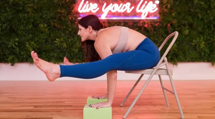 Поместите металлический складной стул в центр коврика с блоком перед каждой ножкой стула. Сядьте на стул и отодвиньтесь так, чтобы бедра по всей длине были на сиденье. Согните колени, поместите руки между ногами и положите на блоки. Положите внутреннюю часть коленей на плечи. Опираясь плечами на бедра, выпрямите ноги прямо перед собой. Ваши ноги должны быть на одной линии с бедрами, которые находятся на уровне стула. Направьте взгляд на пол перед собой и потянитесь грудью в том же направлении. Если выпрямить ноги невозможно, держите колени согнутыми. Задержитесь на 10 вдохов. Чтобы выйти из позы, согните ноги в коленях и поставьте ноги на пол.