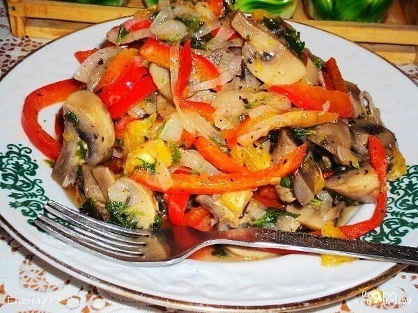 5. К луково-перечной массе добавить отварные шампиньоны, нарезанный кубиками апельсин.