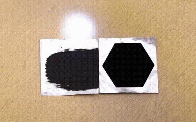 Если на любую вещь, посветить фонариком либо иным источником света, то мы заметим пятно света. Но если направить свет на "Вантаблэк", то светлого пятна уже не будет видно. "Вантаблэк"-это субстанция из углеродных нанотрубок поглощающая почти всё излучение. Это и микроволны и радиоволны. Коэффициент поглощения фотонов 99,965% что в свою очередь говорит о том что лишь очень малая часть света в количестве 0,035% отбросит какой либо свет. Впервые этот материал был показан учеными в 2014 году. Человек смотря на материал воспринимает его не как черный предмет, а как нечто необъяснимое. Производится эта субстанция путём выращивания тех самых нанотрубок, которые и не дают фотонам отражаться от поверхности, на алюминиевой фольге вертикально. В диаметре нанотрубки очень малы. Конечно "Вантаблэк" на сегодня не является лидером по поглощению света, но всё же материал получился очень хорош и пользуется спросом и