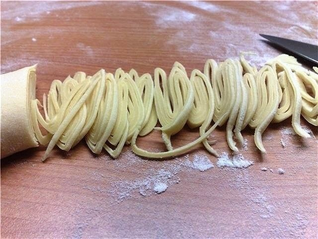 Муку просеять и насыпать горкой. Сверху сделать углубление. Посолить. Яйца взбить и влить в муку. Тщательно перемешать. Оставить на 30 минут. Тесто раскатать пластом толщиной 2-3 мм. Немного дать подсохнуть и нарезать тонкой лапшой.