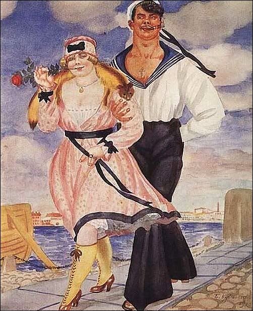 Надо ли говорить, что для схода на берег надо было иметь вылощенный внешний вид, а зачастую ещё носовой платок и две иголки в бескозырке с чёрной и белой нитками. В городе поджидали различные опасности, начиная со злобной комендатуры и её патрулей и кончая "пацаны, мы сами отслужили, давайте накатим за флот, ну вы чё, не моряки, что ли?" А также встречи с представителями других видов войск, что не всегда кончалось мирно. В заглавии картина Кустодиева, эх были времена, когда на всё это смотрели попроще :)