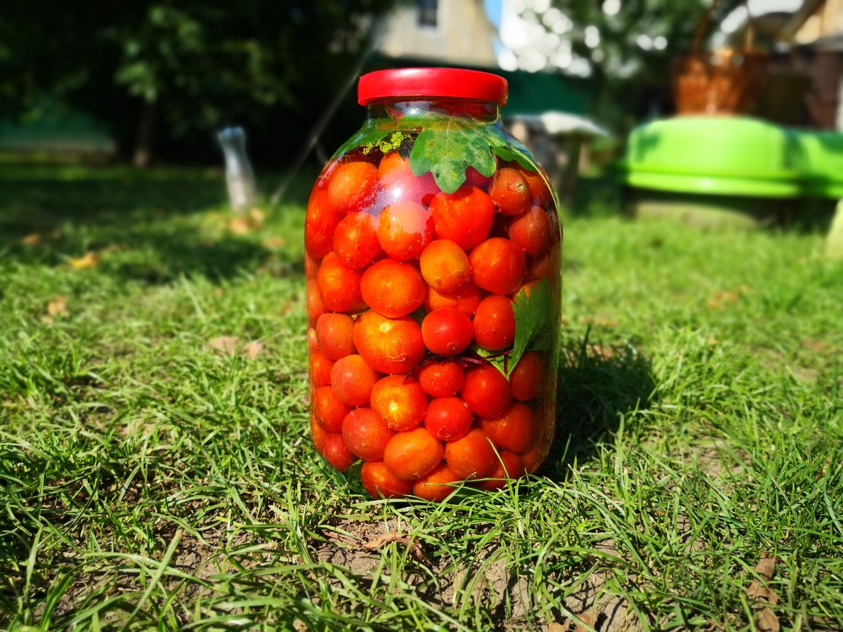 Для приготовления моченых помидоров подойдут как спелые плоды, так и средней спелости, бурые и даже зеленые. Решать вам! А мне в этом году довелось заквасить сочные красные черри, которые целиком взрываются своим необычайным вкусом во рту. Итак, подготавливаем продукты! Собираем и моем под проточной водой помидоры, листья дуба, смородины, вишни, зонтики укропа. Для особого аромата взяла несколько свежих листочков базилика и сельдерея. При желании можно добавить несколько зубчиков чеснок
