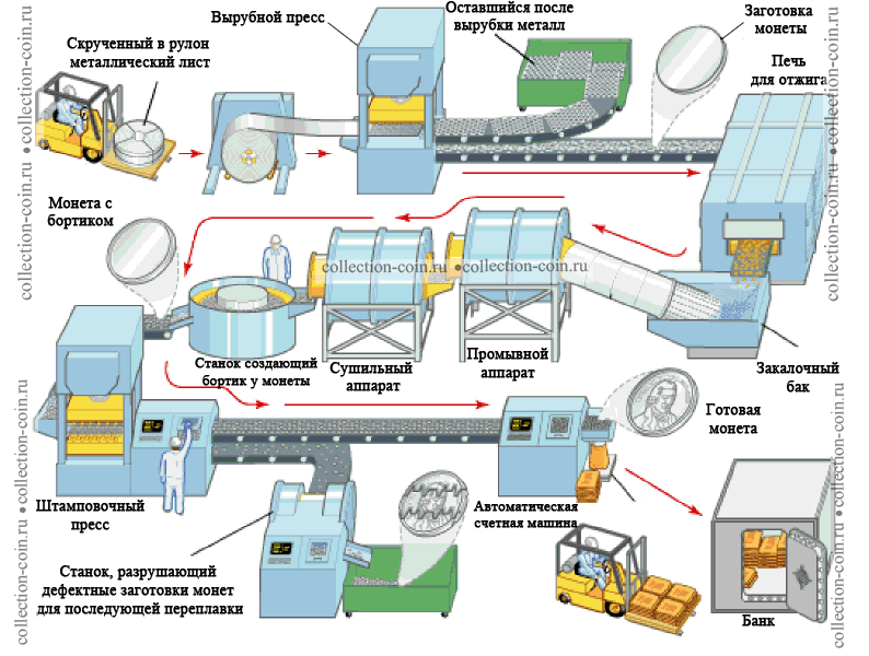 Чеканка монет достаточно трудоемкий, но очень интересный процесс. Рассмотрим основные из них в этой статье. На изображении ниже представлены основные процессы происходящие при чеканке монет. Итак, чеканка монет происходит в несколько этапов: