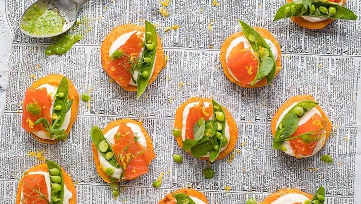 ХРУСТИНИНЫ ЛОСОСЯ ХОЛОДНОГО КОПЧЕНИЯ ОСВЕЖАЮТ БАНКЕТНЫЙ СТОЛ Крекеры из лосося холодного копчения бросают вызов традиционным, обжаренным на масле закускам для кусочков Патонга. Сочетание свежего лосося холодного копчения, острого лимона и аппетитных побегов гороха - гарантированный хит на каждом банкете. Этот рецепт кростина использует сладкий картофель вместо белого хлеба, что делает кростини также пригодной для безглютеновой диеты. Эти изящные, приятные глазу, разноцветные закуски гарантированно исчезнут в устах гостей в кратчайшие сроки! Свежий холодный копченый лосось кростини - это вкусная и простая закуска, которая не требует каких-либо своих фирменных блюд. Ингредиенты, необходимые в рецепте, такие как ломтики радужной форели холодного копчения, сладкий картофель, лимон и сливочный сыр, можно найти на различных полках магазинов по всей Финляндии. Летом, например, горох можно удобно купить свежим с рынка, а настоящий зеленый палец собирает необходимые травы со своего двора. Зам