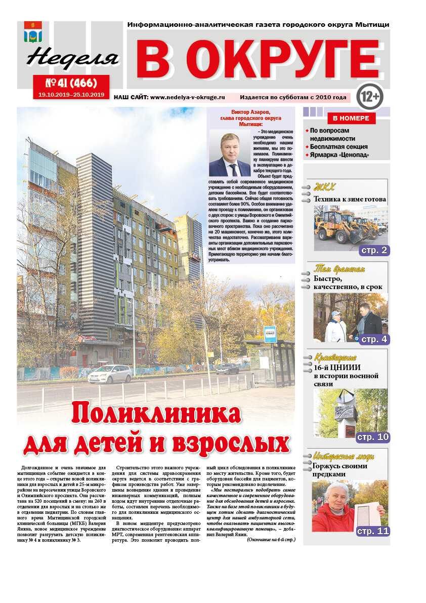 Новый выпуск газеты «Неделя в округе» открывается публикацией о ходе строительства в 25-м микрорайоне новой поликлиники для взрослых и детей, рассчитанной на 520 посещений в смену. Округ активно готовится к зиме: жилищно-коммунальное хозяйство проверяет спецтехнику, профильные службы готовят запасы реагентов для содержания дорог общего пользования и внутридворовых территорий. Дачники считают по осени урожай: председатель Союза дачников Подмосковья, первый заместитель председателя Мособлдумы Никита Чаплин подвел итоги дачного сезона, ответив на вопросы журналистов в РИАМО об основных его проблемах. А представители областного министерства сельского хозяйства и продовольствия вместе с руководителями муниципальных штабов по борьбе с борщевиком подытожили, каких результатов удалось добиться в ликвидации опасного растения. Обо всем этом вам расскажут корреспонденты «Недели в округе» в новом номере. Со страниц газеты также узнаете, как прошло второе заседание нового состав