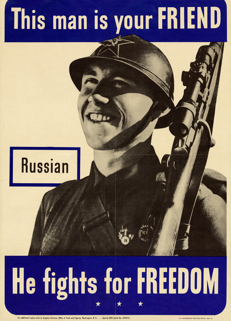Официальное вступление Соединённых Штатов Америки во вторую войну, произошедшее в декабре 1941 года, шокировало большинство американцев. Волна возмущения, вызванная нападением японцев на Пёрл-Харбор, свидетельствовала о том, что сражаться американцы будут — оставалось только выяснить, кто в этой войне свои, а кто чужие. Политика изоляционизма и традиционно невысокий интерес среднего американца к происходящему за пределами страны потребовали прямого указания на тех, с кем можно «пойти в разведку». Широко известна небольшая серия листовок и плакатов под девизом «Этот человек твой друг — он борется за свободу». В начале 1942 года её выпустила «Служба фактов и цифр» (Office of Facts and Figures), отвечавшая за информационную и пропагандистскую работу. Серия включает в себя семь портретов, выпущенных огромными тиражами — англичанина, австралийца, канадца, русского, китайца, эфиопа и голландца. Особый интерес представляет прототип плаката с красноармейцем. На голове бойца каска Адриана с ж
