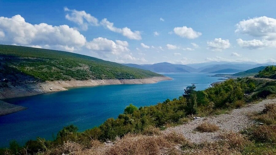 Но вот крутые повороты серпантинов пройдены, дорога спускается вдоль величавых гор и выруливает на изогнутый виадук «Трнова Лука». Поросшие лесом горные хребты сменяются песочными скалами, похожими на куски халвы. Они лежат россыпью вдоль дороги, окружая неподвижное зеркало озера Врджа. Его каменистые берега поросли диким тимьяном, которым пряно пахнет разогретый воздух.