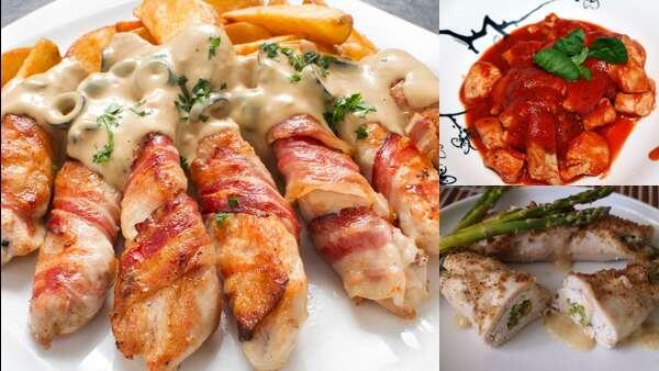 Куриное филе лучший диет продукт Сегодняшние рецепты это просто подарок тем кто любит еду из куриного филе. В рецептах не указаны нормы продуктов, но там и так все понятно. Сразу 8 замечательных рецептов. Курочка в сыре. Филе нужно отбить и обвалять в смеси муки, соли и перца. Приготовить льезон. Для этого взбить яйца, смешать их с натертым сыром. Далее обваливать каждый кусочек сначала в смеси, а потом муке. Немного обжарить, а до готовности довести в духовке. Куриный пирог. Купите готовое дрожжевое тесто и раскатайте его на два одинаковых листа. Приготовьте начинку из вареной курицы, пропущенной через мясорубку, смешать ее с отваренным рисом и поджаренным луком. Это сдобрить перцем и солью. Далее на первый слой выложить мясо, потом второй слой и оставить для поднятия. Далее проколоть тесто в нескольких точках и выпекать около получаса. Блины с филе. Яйца взбить с солью, сахаром и мукой, далее влить немного молока. Смесь нужно взбить и испечь четыре блина. Далее шампиньоны мелко пор