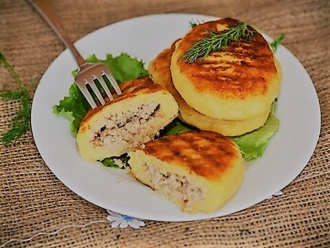 - Берем часть картофельной массы на одну зразу. Делаем на ладони "лепешку" и кладем на середину начинку. Формируем зразу и обваливаем ее в панировочных сухарях.