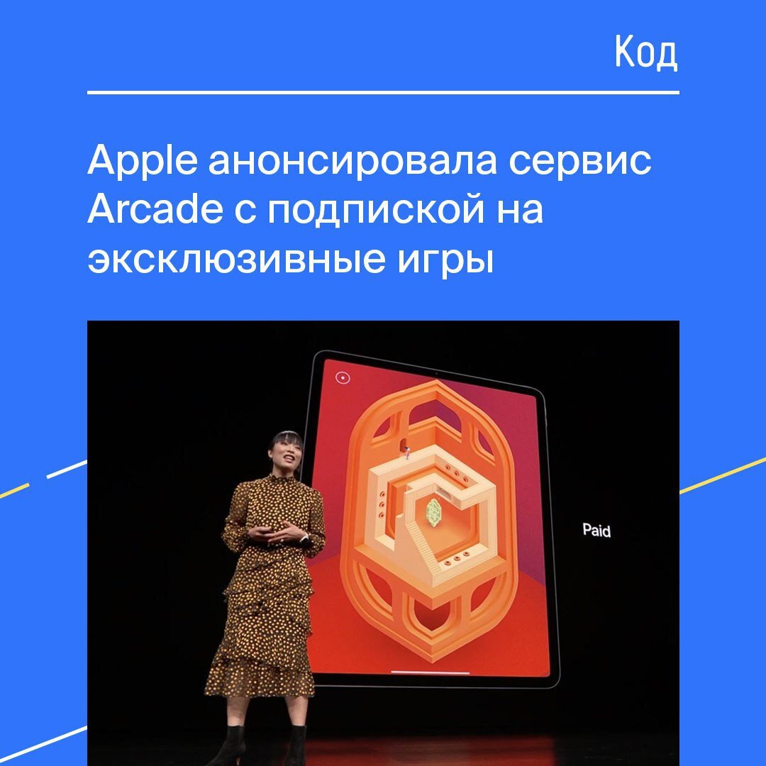 Apple анонсировала сервис Arcade с подпиской на эксклюзивные игры: без встроенных платежей и рекламы. Он даст доступ более чем к 100 играм, которые будут доступны на iOS, macOS и Apple TV. Игры можно будет запускать офлайн, но при подключении к Сети появится доступ к облачным сохранениям. Для Apple Arcade выделят специальный раздел в App Store. Сервис запустится осенью более чем в 150 странах — скорее всего, и в России тоже. Стоимость компания пока не объявила.