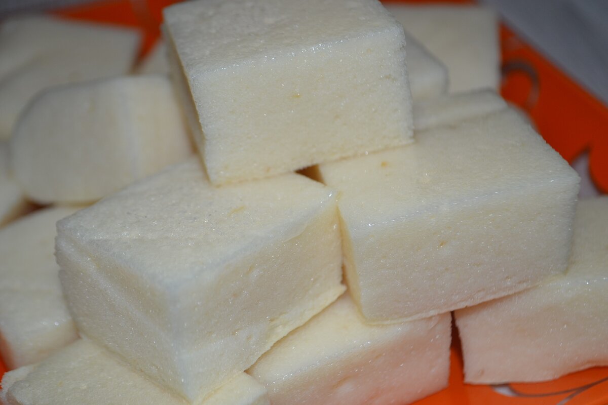 Легкое, воздушное, нежное, вкусное и полезное лакомство без сахара! Этот десерт похож на суфле, приготовить его совсем не сложно, обязательно попробуйте! Ингредиенты: Приготовление: Для приготовления понадобится яблочное пюре, его можно приготовить самим, можно купить, я делаю и так и так, всегда получается. Приготовить яблочное пюре проще простого. Для этого яблоки нужно помыть, очистить от кожуры и нарезать, переложить яблоки в форму и выпекать 25 минут при температуре 180 градусов. Готовые остывшие яблоки перекладываем в миску и измельчаем погружным блендером до пюре. Затем добавляем в пюре быстрорастворимый желатин, перемешиваем и оставим на 15 минут. После чего прогреваем яблочное пюре с желатином в микроволновке, чтобы желатин растворился. Даем пюре немного остыть (можно поставить в миску с холодной водой) и взбиваем до пышной массы. На это уйдет минут 5-7. Масса увеличится в два раза в объеме, станет кремового цвета. Форму застелем пищевой пленкой, переложим массу в форму и убир