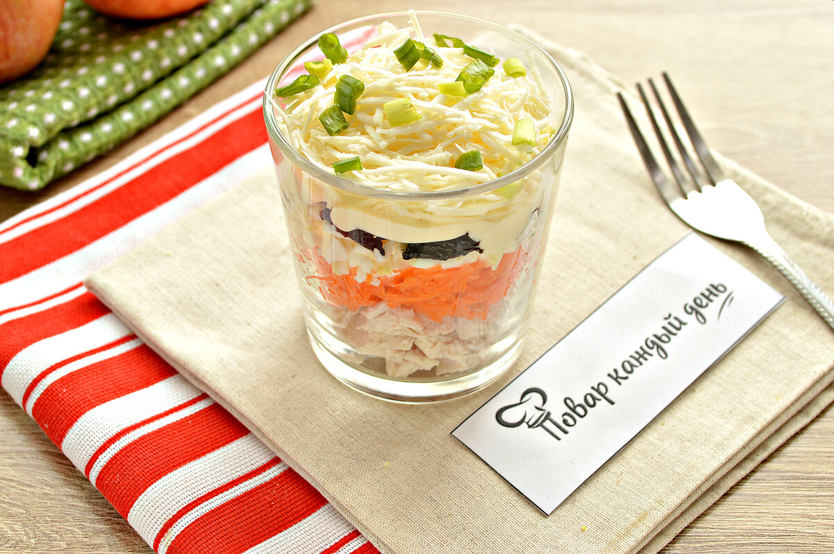 Приготовила необычный салат в стаканчике. Получилось красиво и очень вкусно.