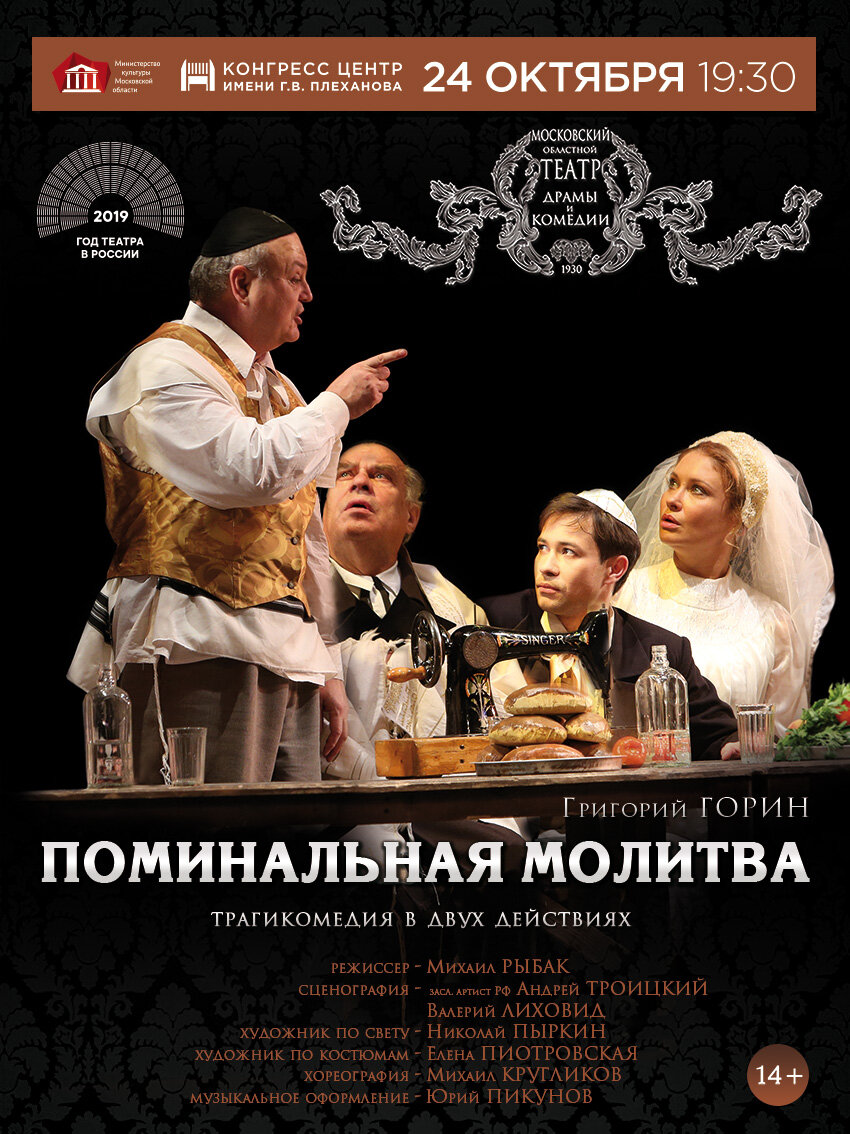 Поминальная молитва Григория Горина на сцене Конгресс-центра Плеханова В Москве начинаются гастроли Московского Областного театра драмы и комедии в Москве: 24 октября театр под управлением народной артистки России Елены Цыплаковой впервые представит гостям Конгресс-центра им. Плеханова свою трактовку легендарной пьесы Григория Горина по мотивам произведений Шолом-Алейхема «Поминальная молитва». «Поминальная молитва» в постановке режиссёра Михаила Рыбака (Германия) – это спектакль о людях, обращающихся к Богу на разных языках, но абсолютно одинаково любящих , страдающих, смеющихся и плачущих. Действие происходит в начале прошлого века в бедной украинской деревне Анатовке, в период массовых еврейских погромов. Бедный молочник Тевье цитирует Священное Писание и пытается устроить судьбу своих пяти дочерей. Услуги традиционной свахи не срабатывают, и дочери самостоятельно принимают решение относительно своего будущего. Старшая, отказавшись от «выгодной» партии с богатым мясником, выходит