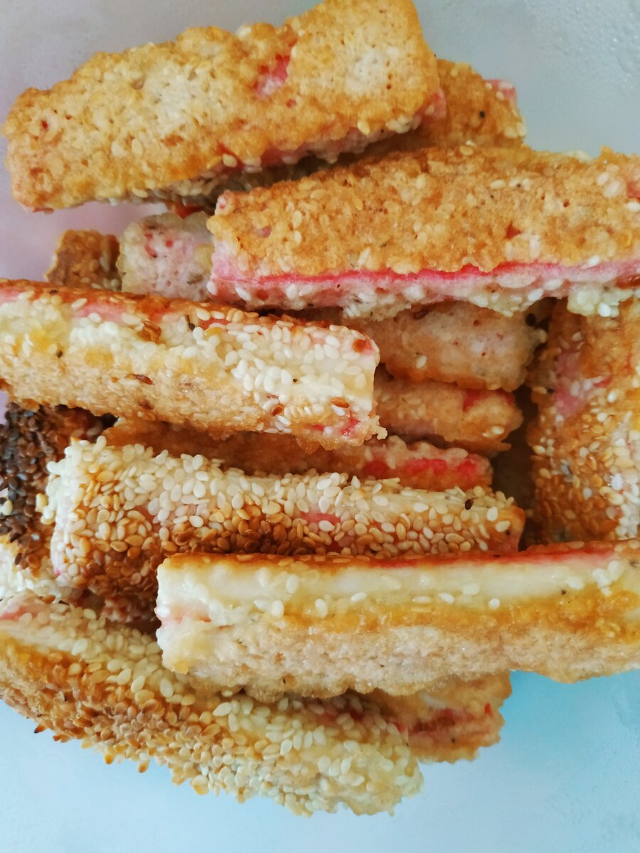 Бывало у Вас, что хочется чего-то вкусненького да чтобы времени и затрат на приготовление минимум? Этот рецепт из серии быстрых, легких и вкусных блюд. Ингредиенты: 200 гр. крабовых палочек, 2-3 яйца, 1 ст. ложка муки, щепотка соли, 2 ст. ложки подсолнечного масла, кунжут светлый или черный, на ваш вкус. Крабовые палочки размораживаем, выкладываем на бумажное полотенце, чтобы убрать лишнюю влагу. В миске взбиваем яйца с солью, можно добавить так же любимые вами специи. Кладем в яйца муку, перемешиваем до однородной массы. Добавляем в наш кляр кунжутные семечки. Обмакиваем каждую палочку в кляре, стараясь, чтобы прилипло как можно больше кунжута. Жарим крабовые палочки на хорошо разогретой сковороде в подсолнечном масле. Вкусно как в горячем, так и в холодном виде. Можно обсыпать готовые палочки зеленью, можно есть, обмакивая в кетчуп или любой другой соус. Отличный вариант для перекуса на природе или на работе. Калорийность крабовых палочек в кляре - 120 калорий в 100 граммах. В