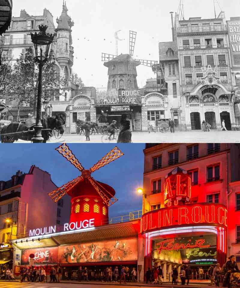 1. Кабаре Мулен Руж в Париже, Франция. 1950 и 2018 год. Это место, где известные французские художники, такие как Анри де Тулуз-Лотрек, часто проводил время до того, как кабаре был случайно сожжен в 1915 году. Позже он был перестроен и возрожден как клуб для артистов в 1920-е годы и далее, и принимал таких знаменитостей, как Mistinguett, Edith Piaf и Charles Aznavour. Сейчас он в первую очередь служит туристической достопримечательностью, с экстравагантными шоу, наполненными яркими огнями и костюмами, которые открыты для публики.
