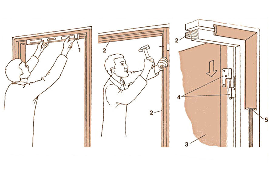 Для установки межкомнатных дверей потребуется следующий инструмент: - крестовая отвертка или шуруповерт с битой; - стамеска шириной 10 – 15 мм; - киянка; - слесарный молоток; дисковая пила или ножовка; - угольник; строительный уровень; карандаш; - канцелярский нож. Расходные материалы: саморезы по дереву длиной 50 мм; дюбель – шурупы размерами 6 х 75 мм. Самые ходовые стандартные размеры дверей следующие – ширина 70, 80, 90 см., высота 2 м. Вначале установки готовятся заготовки коробки, для этого нужно по ширине отверстия в стене под дверь отрезать одну заготовку. Далее по стандартной высоте 2 м отрезаются боковые заготовки. Причем необходимо сделать вырезы по высоте для плотной укладки верхней заготовки коробки. Заготовки коробки укладываются на пол по требуемому под дверь периметру. Рулеткой вымеряется ширина двери плюс 6 мм припуска (по 3 на каждую сторону) и делаются наметки карандашом. По этим наметкам верхняя планка коробки прикручивается к боковинам четырьмя саморезами диаметр
