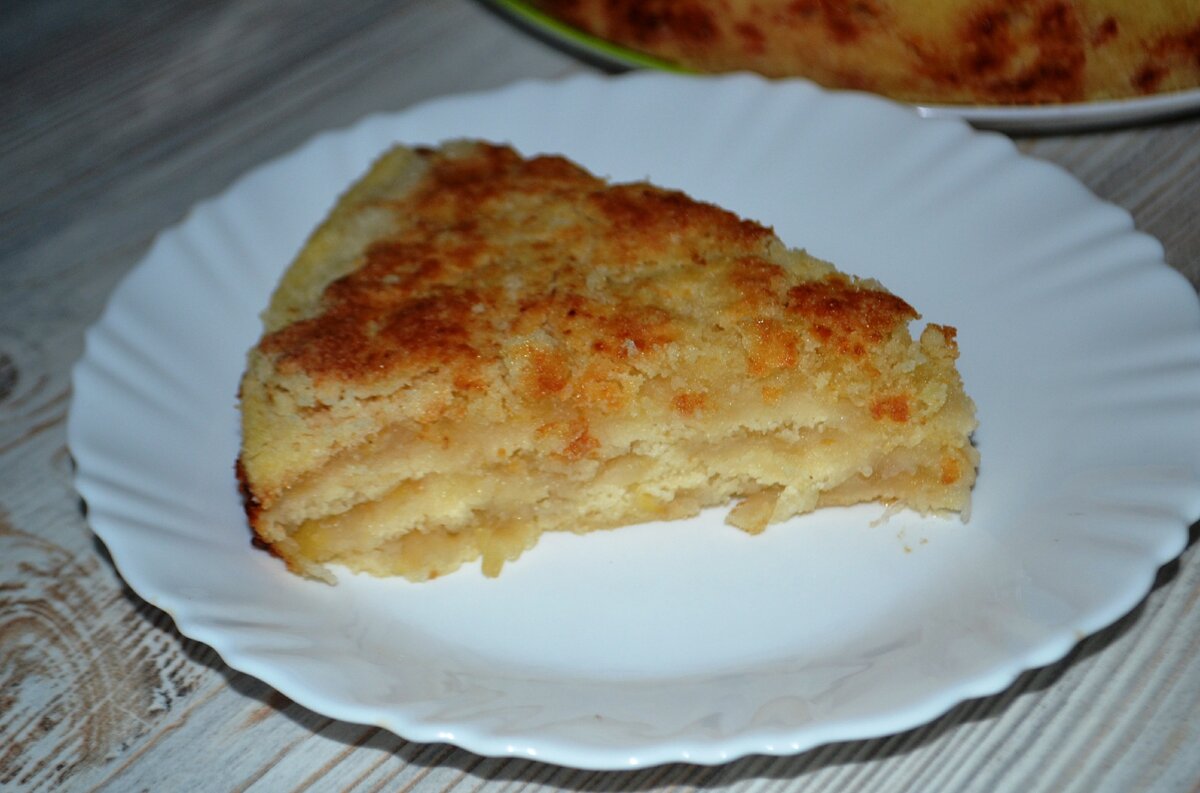 У вас получится четыре слоя теста и три слоя яблок. На верхний слой теста натираем на крупной терке сливочное масло.