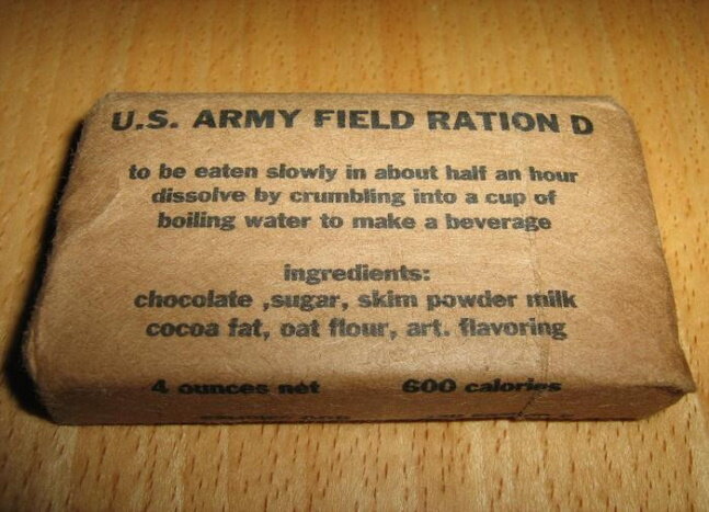 Американцы долго задавались вопросом, как обеспечить провиантом войска чтоб сражаться даже в ситуациях, когда поставки обычной военной еды были невозможны. Войска в окружении, далеко за линиями противника, пилоты после крушения, все они имели бесценного и чрезвычайно отвратительного союзника - шоколад Херши. Необходимо было разработать пищу, которая была легкой в транспортировке и богатой энергией. Выбор был сделан и это был шоколад. Фабрика Hershey Chocolate Company в 1937 году обратилась к правительству США , чтобы создать шоколад , который соответствует четырем ключевым критериям: будет весить до 113 граммов , будет чрезвычайно высокой калорийности, не будет таять и будет вкусным , по крайней мере немного лучше , чем переваренные помидоры. По словам солдат, конечный продукт под названием D-ration bar не соответствует по крайней мере последнему упомянутому условию. Вкус этого шоколада был отвратительным, и его практически невозможно было съесть.