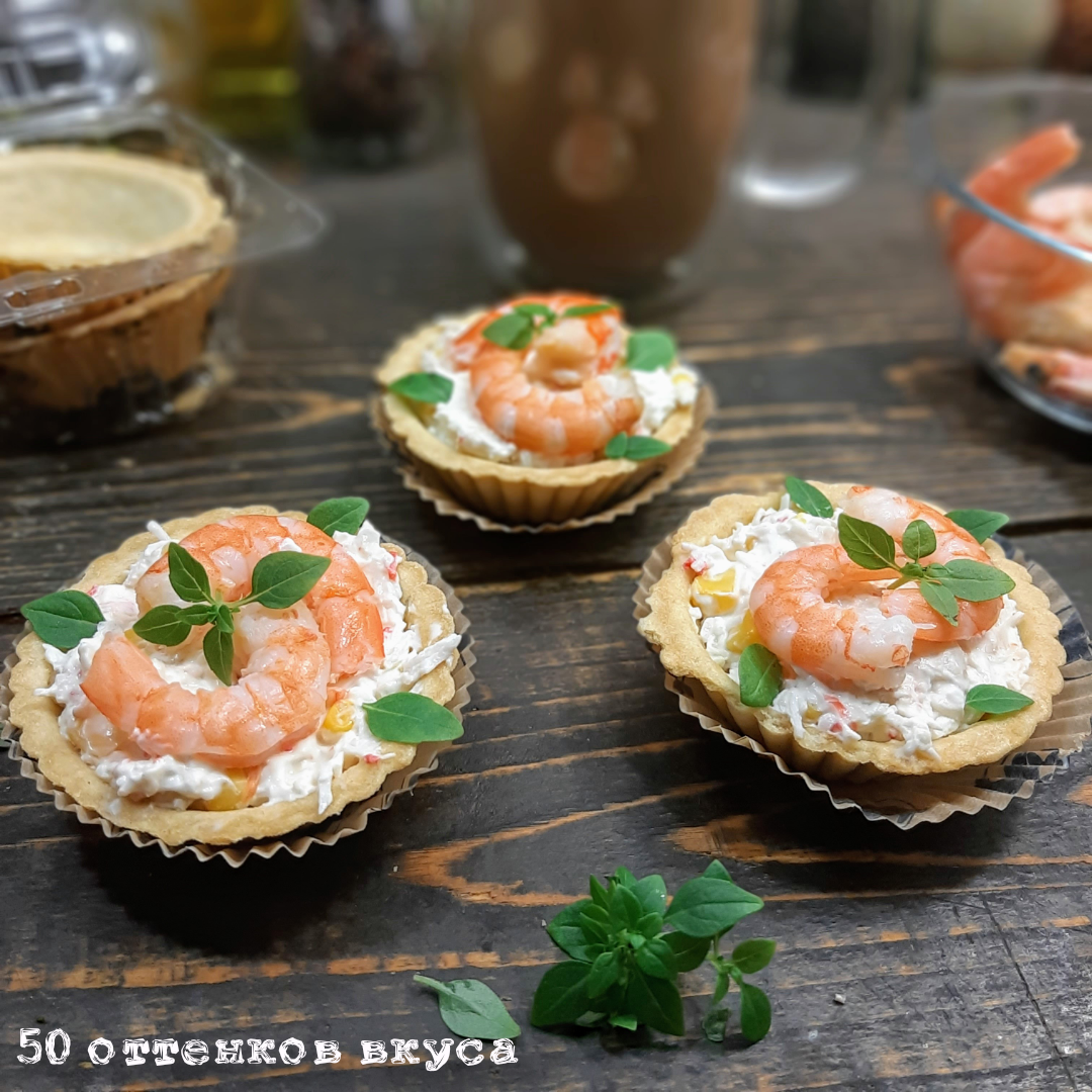Сытного стола вам мои дорогие гурманы! Не за горами новогодние праздники, и пора уже начинать подбирать рецепты для праздничного стола! Всевозможные закуски, салатики, тортики, и еще много всего от чего каждый новый год наши столы ломятся, а как мы истинные гурманы, просто требуем разннобразия! Чего, чего, а на праздники мы любим покушать! Сегодня я подготовил для вас рецепт тарталеток с морепродуктами, которые доступны в любом магазине. Это конечно же креветки! Начинка для тарталеток готовится очень быстро, больше всего отнимает времени чистка креветок. Для этой замечательной закуски нам понадобятся тарталетки, их я купил в магазине, моя не любовь готовить тесто зашкаливает. Также нам понадобятся креветки 3 штуки на одну тарталетку, упаковка крабовых палочек, сладкая кукуруза, и сливочный сыр ( у меня маскарпоне) и зелень для украшения. Как я уже говорил начинка готовится очень быстро. В одной из следующих статей, я расскажу как правильно выбрать хорошие крабовые палочк