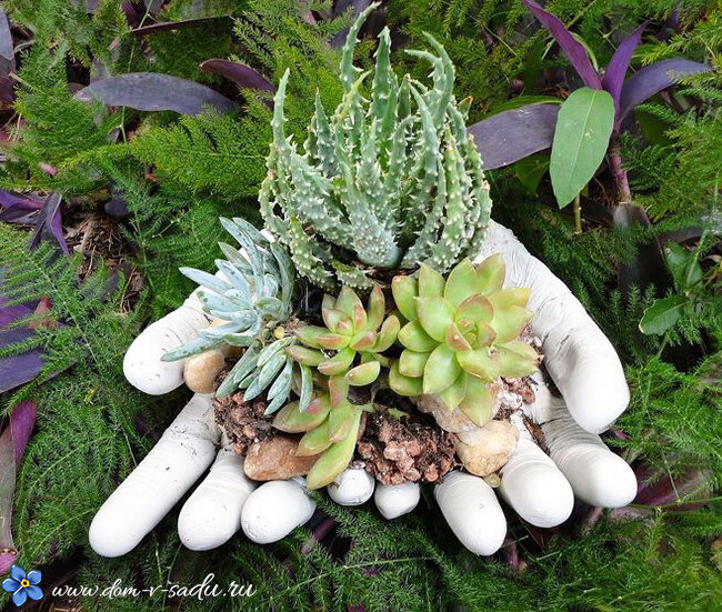 Я преклоняюсь перед садоводами, которые не только выращивают овощи и цветы на своем загородном участке, но еще и создают великолепное потрясающее оформление клумб. Придумать идею, найти время и создать что-то оригинальное могут не все. Пройти мимо этой красоты просто невозможно. Так и хочется остановиться, и как оформить клумбу на даче. Такие, необычные идеи оформления клумб меня всегда восхищают, поэтому я разузнала, как красиво оформить клумбу и делюсь с вами. Тем более, что делать ее легко и быстро! Не скрою, что сначала процесс, как можно оформить клумбу меня испугал, но, увидев результат, я начала мечтать о такой же! Креативное оформление цветочных клумб Чтобы сделать такие цветочные клумбы будут нужны: Как делать клумбы — ладони. Красивое оформление клумб начинается с подготовки цементного раствора. Возьмите небольшое количество сухого цемента и разведите его по инструкции. Затем возьмите самые обычные резиновые перчатки, лучше самого большого размера, и наполните их цементом.