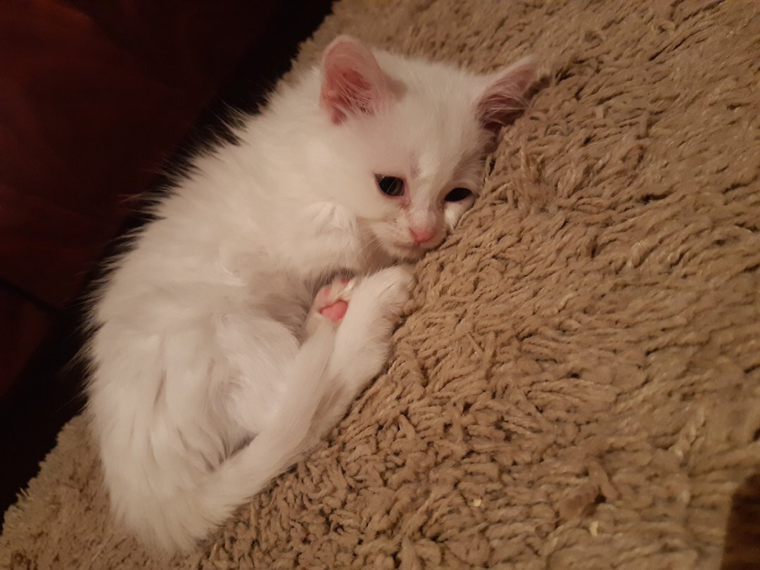 Вот такое белоснежное облако досталось волонтеру Владе от знакомых! С их слов котенка подобрали в подъезде. Ну нашли ребята, а куда дальше проблемы волонтера очевидно, ей же больше всех нужно! Белоснежная шубка была сероватого оттенка, видимо пребывала на свободе не один день. ((( В общем девушка ее отмыла, накормила, спать уложила. Возраст 2.5 месяца. Девочка оказалась мега-гиперактивная! В первый же день, поставила на уши весь кошачий коллектив! Спустя несколько дней, Влада заметила что котёнок не реагирует ни на какие звуки... оказалось врождённая глухота. В голову пришла только одна мысль, что возможно из-за этого дефекта кошуля и оказалась в подъезде. И все равно волонтер и все мы очень надемся, что все-таки ей повезёт и чудо произойдет, ведь она абсолютно ничем не отличается от своих сородичей ! История №2.