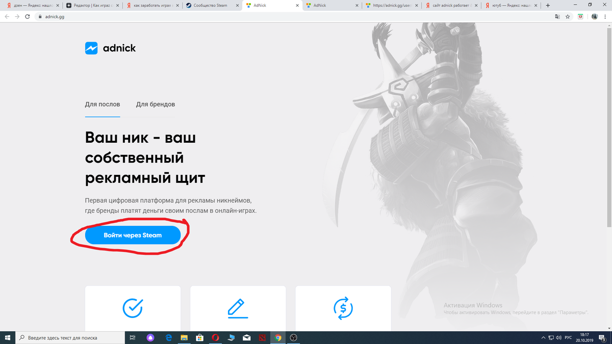 Сегодня я расскажу про сервис позволяющий заработать игра в любимые игры. Итак сайт Adnick - (рекламный сервис ) в котором вы меняете ник на тег сайта. За одну игру с тегом вы можете заработать от 0.01-0.08$. 1)Заходим на сайт Adnick вот ссылка https://adnick.gg?referal=U6ObkOj3K9aoU8Tw .