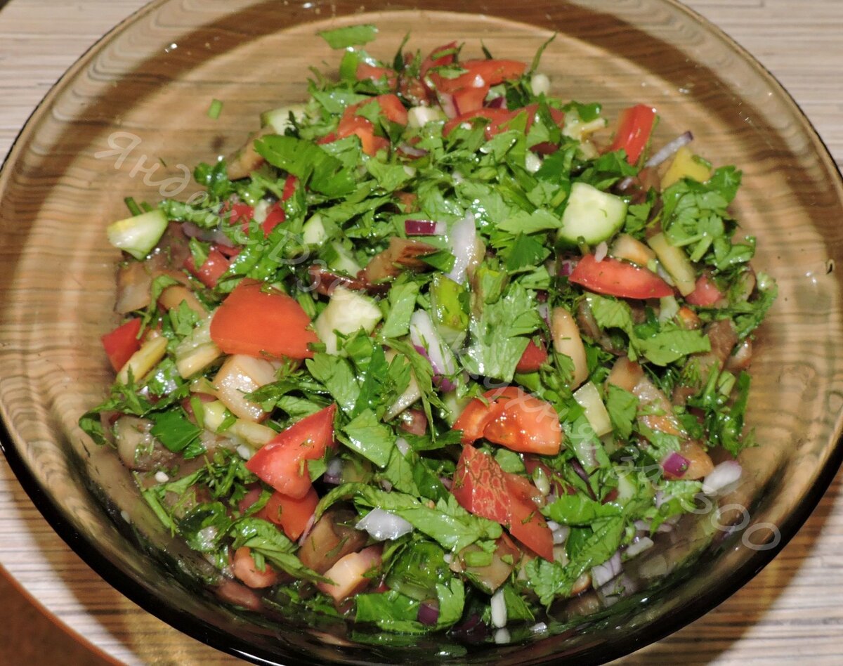 Лёгкий овощной салатик будет актуален в любое время года. Рецепт этот мы придумали еще года 2 назад, и с удовольствием им делимся. Состав: Баклажан – 2 шт. (или 1 большой), Огурец – 1 шт., Помидор – 2 шт., выбираем среднего размера, не сильно сочные, Половинка синей (крымской) луковицы, Болгарский перец – 1 шт., Чеснок – 1 зубок, Две веточки кинзы, Пять веточек укропа, Соль, масло подсолнечное и оливковое. Важно! При некоторых заболеваниях, таких как сахарный диабет, гипертония, тромбоз, тромбофлебит, и некоторые другие, от употребления кинзы лучше отказаться. Баклажан очищаем от кожуры, нарезаем небольшими ломтиками, солим и обжариваем на подсолнечном масле, на сковороде. Пока жарятся баклажаны, режем кубиками лук и маринуем его в течение 20 минут. Для маринада нужна 1 ст. ложка яблочного уксуса, 3 ст. ложки воды. Нарезаем кинзу и укроп, кубиками нарезаем помидоры, огурцы и перец. Мелко режем чеснок. Добавляем поджаренные баклажаны и маринованный лук, солим и перемешивае