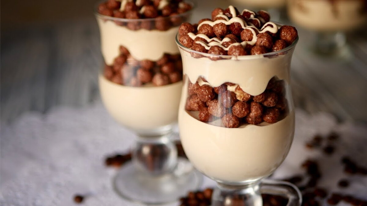 Всем огромный привет! Сегодня предлагаю вам нежный пористый десерт для всех любителей кофе. Ингредиенты: Для начала следует замочить желатин. Берём где-то полторы столовые ложки и заливаем или молоком, или водой. Оставляем набухать. Готовим кофе. Где-то на 150 миллилитров кипятка берем три с горкой чайные ложки растворимого кофе и хорошенько потом его охлаждаем. Сливки взбиваем вместе с сахаром до устойчивой пены. Сливки готовы уже. На плите распускаем, охлаждаем и добавляем желатин, при этом взбивая смесь и также добавляем кофе. Креманки где-то на треть заполняем полученной смесью и ставим пока что в холодильник, чтобы оно немного застыло. Когда смесь уже хорошо застынет, берем сухие завтраки в виде вот таких вот шоколадных шариков и делаем слой из них. Покрываем еще одним слоем приготовленной смеси и снова посыпаем шоколадными шариками. Сверху можно сделать небольшие такие вот разводы. Ставим в холодильник, чтобы десерт полностью застыл и в принципе уже всё готово. Посмотрим н