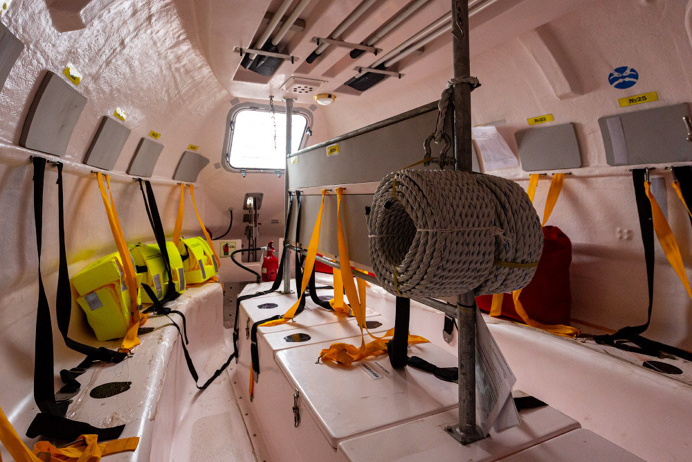 На арктическом танкере «Штурман Скуратов» «Газпром нефти» мы прошли инструктаж по правилам поведения на борту, использованию спасательных средств. Отдельно нам показали, как устроена противопожарная система и современная шлюпка. Самое главное правило для пассажиров очень простое — в случае объявления шлюпочной тревоги тепло одеться, взять сумку с гидрокостюмом и спасательный жилет. С этим комплектом прибыть на мостик и ждать указаний.