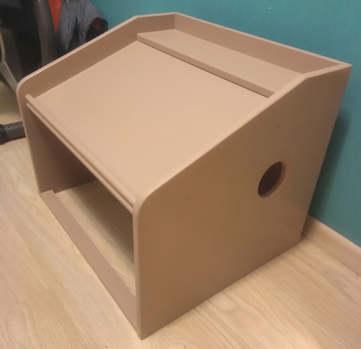 Доброго времени суток, давненько я не садился за компьютер, совсем не было времени, а между тем кое что под копилось из моих самоделок, чем с удовольствием поделюсь с Вами. Старший сын учится в начальной школе и его класс сейчас переезжает в новый кабинет. Для докладов и выступлений понадобилась трибуна, на что с радостью я откликнулся, мне совсем не сложно, а к тому же интересно. В качестве материала выбрал МДФ толщиной 16 мм, работать с этим материалом мне очень нравится, он легко обрабатывается и красится. Начал с раскроя листа МДФ, мой распиловочный самодельный и покупной столы не позволяют работать с крупным листовым материалом, по этому приобрел себе ручную циркулярную пилу Metabo KS 55, в качестве направляющей шины отлично подошел обрезок фанеры. Для начала отрезал три основные части заготовки, кстати размеры будущей трибуны 55х45х45 сантиметров. Получилось что-то наподобие коробки. Затем вырезаем остальные детали, их у нас получается 4 штуки, полочка для стаканов и минерально