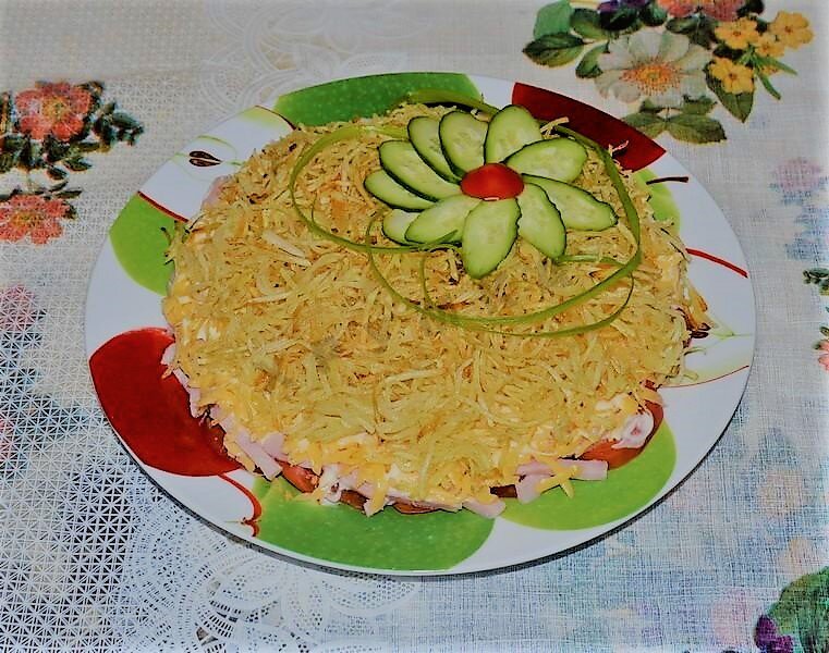 - Сверху на сыр выкладываем наш картофель. Даем постоять салату примерно полчаса и подаем к столу.