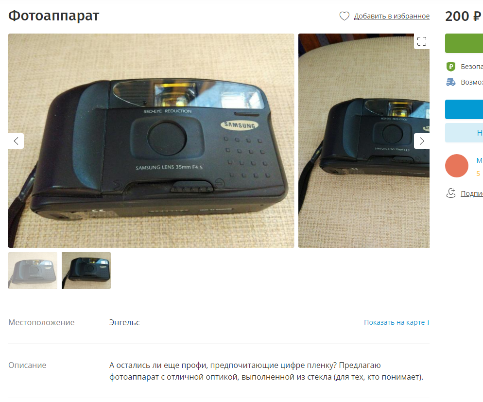 В моих планах было рассказать про линейки Samsung, но я не знал с чего начать – с новых или со старых. И тут мне попалось объявление, где старенький Samsung FF-222 сопровождается красивым описанием. Всегда интересно читать объявления, в которых авторы пишут больше чем «Плёночный. Работает. Торг.». Так нужен ли «ценителю» и тому «кто понимает» данный фотоаппарат? Нет, я бы не купил. Почему? В конце объясню!