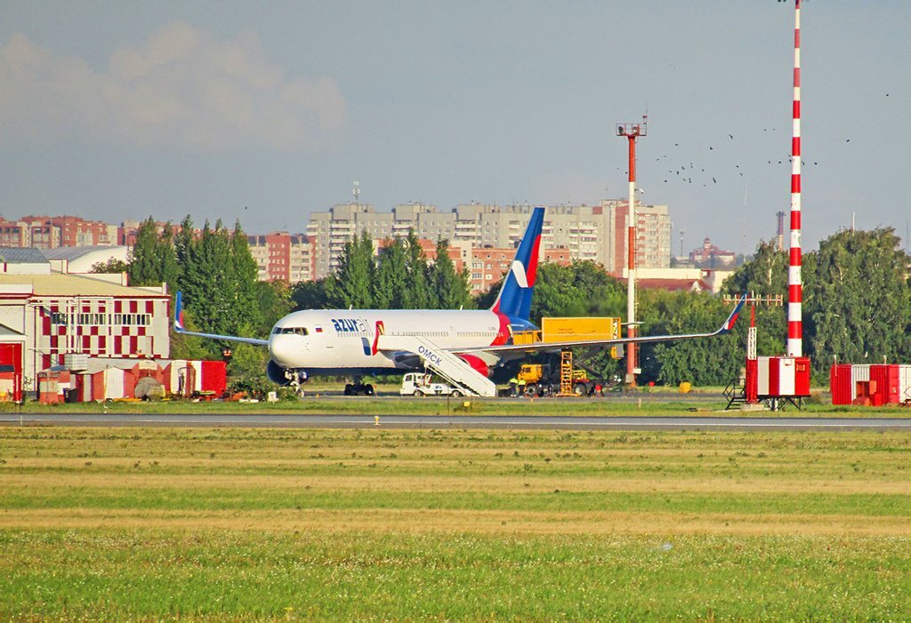 Всем привет. Самым большим самолётом, которого омский аэропорт способен принять без трудностей является Boeing 767. Из-за своих крупных размеров он очень любим среди местных споттеров. А я всё хотел отснять версию с винглетами, но такой всё не прилетал. И вот в один из крайних дней августа он пожаловал, причём сделал это в необычно раннее время : в районе 15 часов. К сожалению, подснять батоном на заходе мне не довелось, поэтому оставалось лишь ехать на вылет. Благодаря отличному трафику, свету и погоде поснимал на одном дыхании. О чём сейчас и расскажу. На удивительно долгом обслуживании главный виновник вылазки. В зависимости от ветра, самолёты ставят либо мордой к ВПП, либо задом. Последний вариант наиболее популярен, но в данном случае всё иначе. С очень большой задержкой улетают казахи в Нур-Султан. С непрекращающемся приходом новых Embraer E190-E2, с позволения сказать, старенькие Embraer E190 Air Astana постепенно выводит из парка. Так его уже покинули борта P4-KCC и P4-KCD. P