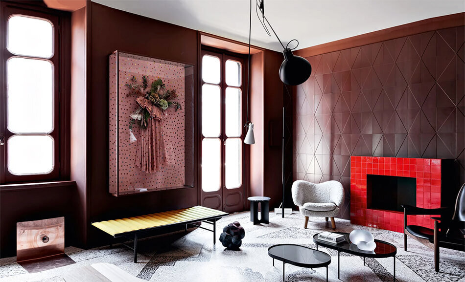 "Она несла в руках тревожные цветы"..., - писал Булгаков. "Какие же они тревожные?", - удивлялась я. И, глядя на эти интерьеры, я понимаю, что такое "тревожно" от одного вида. Эта квартира была представлена на Milan Design Week 2019 студией H+O, которой владеют Элиза Оссино и Жозефина Аквама Хоффмейер. Инсталл яция называется "Perfect Darkness". Необычное сочетание цветов, изящная мебель... И мне обычно нравится темный цвет. Но почему-то здесь возникает ощущение тревоги. Впереди ждет что-то красное страшное. Впрочем, некоторые детали просто мрачноваты. Как эта серая прихожая. Хотя колоннам в плитке и радиатору нельзя отказать в лаконичности и элегантности. Но самое интересное ждет впереди. Если комната со столом (это кабинет? столовая?) напоминает холл в студенческом общежитии: Кстати, плитка-лего смотрится очень интересно: То кухня как будто из времен победившего модерна: Лаконично, функционально, сделано на века. Кстати, не только отказ от верхних ящиков, но и свободный пол визу