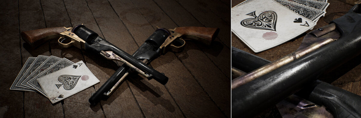 Я использовал World Of Guns - это симуляция, в которой можно собирать и разбирать оружие. Там были различные виды Кольта (Colt Navy), а их механизмы как раз схожи, так что я мог использовать его, чтобы разобраться с тем, как работает пистолет. Также я посмотрел около 20 часов видеозаписей, в которых люди разбирают и стреляют из пистолетов, это помогло мне понять, как материалы взаимодействуют со светом в разных условиях.