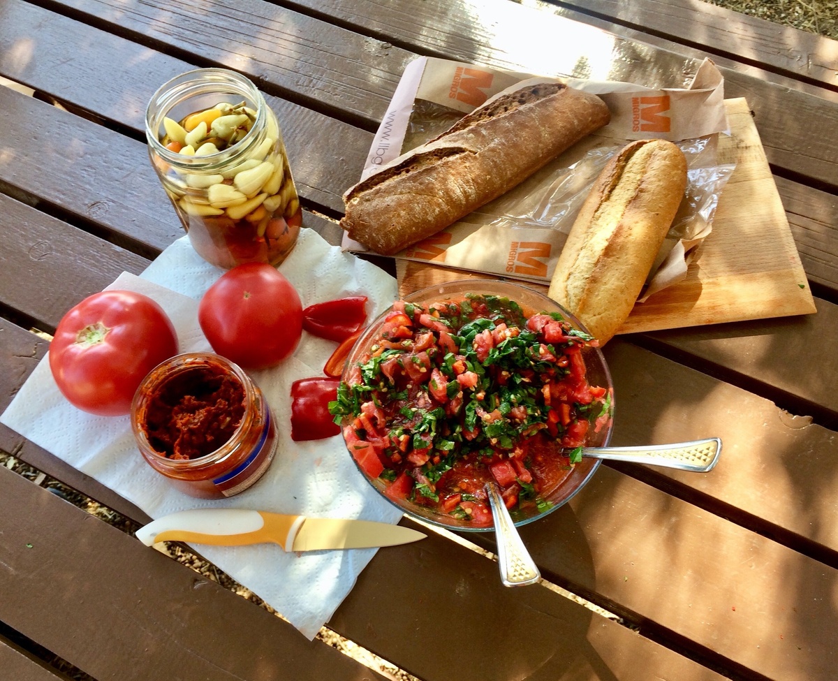 Помню из ядерной физики: масса целого не равна сумме масс осколков. Так вот с кулинарией такая же история: сумма хорошего даёт не хорошую сумму, но более лучший результат. У моей жены Анны всё давно отшлифовано: помидоры только розовые, нужной мягкости и считанного количества; травки пучок с круглыми листочками с названием семизоту (портулак) и пучок руколы; перец красный нужной остроты уже взят на базаре в первые дни, свежий и пахучий; масло оливковое местное деревенское, не горчит совсем, взято в турецком магазинчике деревенской вкусноты; там же прихвачена бутылочка гранатового сиропа; хлебушек штучный из мини-пекарни, - в 15 часов Аннушка разливает масло и соединяет все эти прекрасные сами по себе ништяки в одно просто восхитительной целое - название в разработке - вкусноты неописуемой. Когда Анна начинает резать овощи, к столу - как они узнают? - собирается куриное сообщество кемпинга. Возглавляет его два рябых петуха обжоры, секс-террористы. Активность этих петухов просто