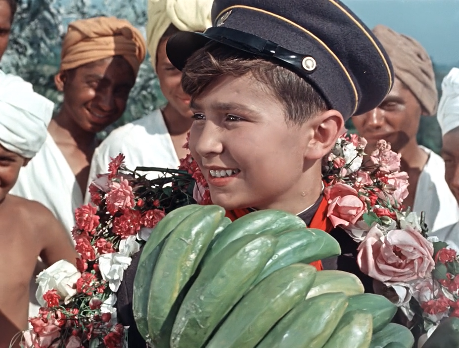 Когда я в детстве смотрела фильм Старик Хоттабыч, то сцена с зелеными бананами не вызывала у меня абсолютно никакого диссонанса. Мало того, подозреваю, что когда я в детстве смотрела этот фильм, то я даже не знала, что это именно бананы. И только недавно, случайно наткнувшись на этот фильм именно на этой сцене, заметила, что во-первых, они бутафорские, а во-вторых, что они непонятного зеленого цвета, словно покрашены масляной краской, какой в старые времена красили коридоры в больницах. Мои изыскания на эту тему привели к удивительным результатам. Оказывается, в пятидесятых годах - а фильм вышел на экраны страны в 1956 году - в СССР бананов не было. Вот просто вообще не было. И даже на высоком государственном уровне, а фильм снимался по заказу Гостелерадио с целью дать достойный ответ Голливуду, не смогли достать связку бананов. Но почему же они такие зеленые? Почему, сделанные из папье-маше бананы, не покрасили в правильный симпатичный желтый цвет? Все просто. В СССР просто не знали,