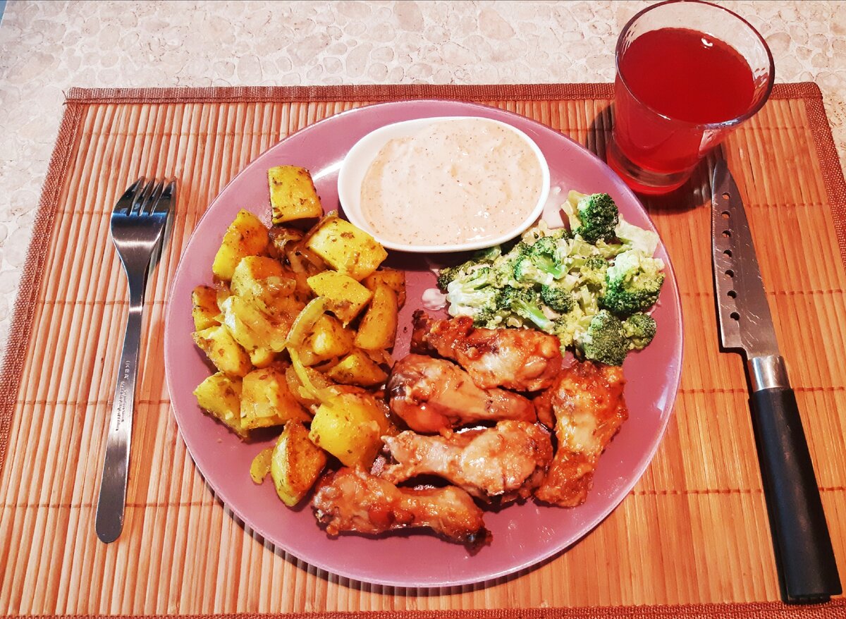 Здравствуйте, сегодня я представлю Вам ужин на скорую руку для всей семьи Для этого нам понадобятся следующие ингредиенты: · Голень крыла курицы – 1кг. · Майонез – 200 гр. · Томатный кетчуп – 200 гр. · Перец черный молотый – 1/2 чайной ложки · Чеснок – 2 зубчика · Зира – 1/2 чайной ложки · Капуста брокколи – 400 гр. · Лук репчатый – 2 маленькие головки · Куркума – 1/2 чайной ложки · Картофель – 1 кг. · Компот из плодов ягод – по вкусу · Соль – по вкусу · Оливковое масло – 50 гр. · Лук парей сушеный молотый – 1/2 чайной ложки Готовим: Голень крыла: Берем глубокую емкость укладываем голень, солим, перчим по вкусу добавляем 2 ст. ложки майонеза и кетчупа перемешиваем накрываем крышкой и убираем в прохладное место чтобы настоялось пока готовим картофель. Картофель: Чистим картофель и режим на кубики, добавляем репчатый лук, нарезанный полукольцами. Складываем в глубокую емкость перчим, солим по вкусу, добавляем куркуму и заправляем оливковым маслом. Все это тщательно перемешиваем в мис