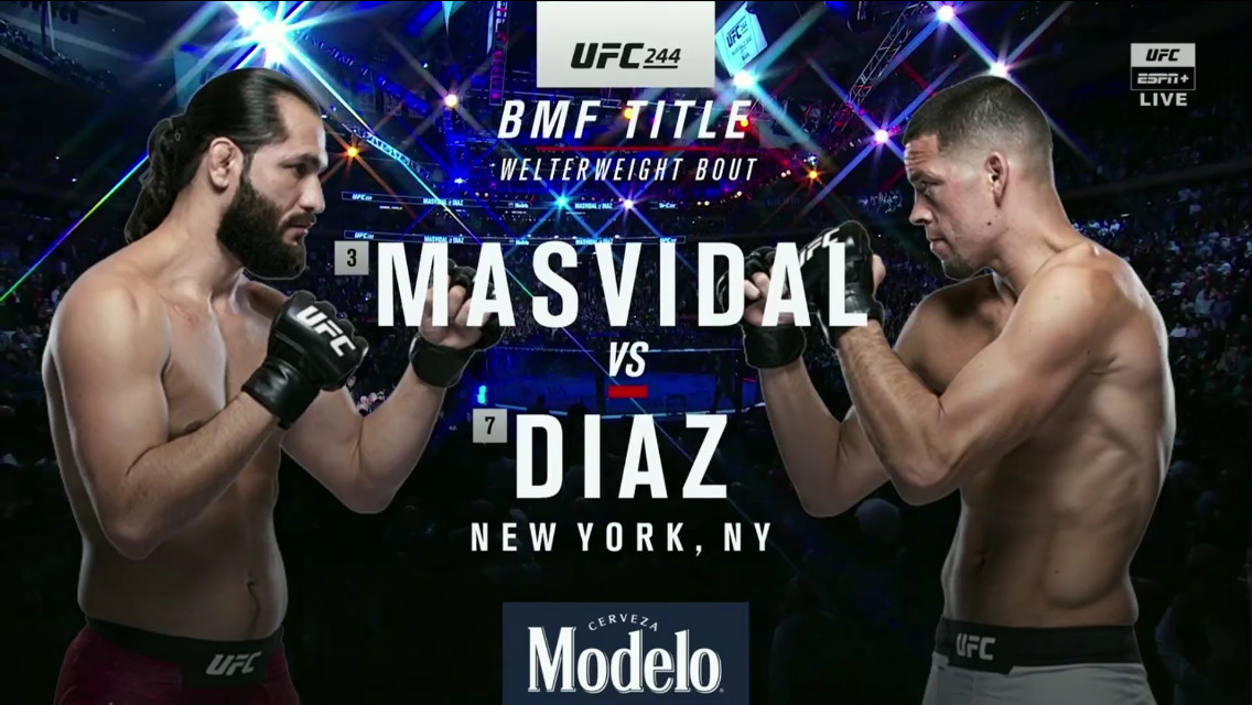 На UFC 244 3 ноября 2019 года впервые разыгрался титул BMF ( титул самого жесткого гангстера UFC) между Хорхе Масвидалем и Нейтом Диазом , событие проходило в Нью-Йорке на Мэддисон Сквер Гарден. Бой проходил по правилам чемпионского поединка-5 раундов по 5 минут. Пояс должен был вручить Дуэйн "Скала" Джонсон. Хорхе в 2019 году шел на серии из 2-ух победах нокаутом (KO/TKO). Диаз же после трехлетнего простоя в 2019 году победил Энтони Петтиса. В первом раунде Хорхе нанес удары локтем Нейту на выходе из клинча, тем самым посек его лицо. Весь раунд Масвидаль доминировал над соперником. Во втором и третьем раунде шло настоящее рубилово Хорхе смотрелся очень хорошо, его атаки были значимее и более опасные, чем у Диаза, который тоже хорошо попадал, но этого было недостаточно. После 3 раунда врач остановил бой из-за сильного рассечения у Нейта Диаза, многие не согласны с таким решением, припоминая боксерский поединок Фьюри и Валлина... Кто знает, как бы продолжился бой, зная как ведет себя