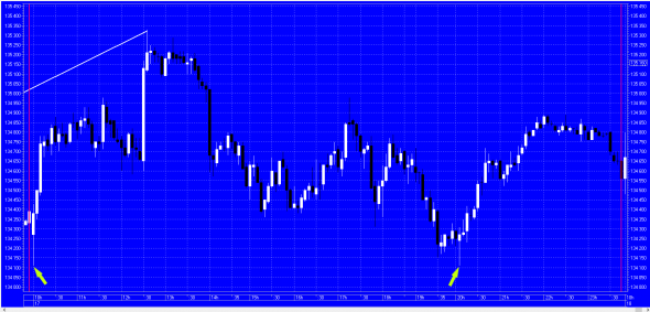 Не пойму, от чего нехватка сил идти вперед? Начинаем наблюдения со вчерашнего дня: Открытие свеча касается уровня 134 110 и инструмент уходит вверх. до 12:35 растем, далее 7 часов кривых движений срывками, но падаем
